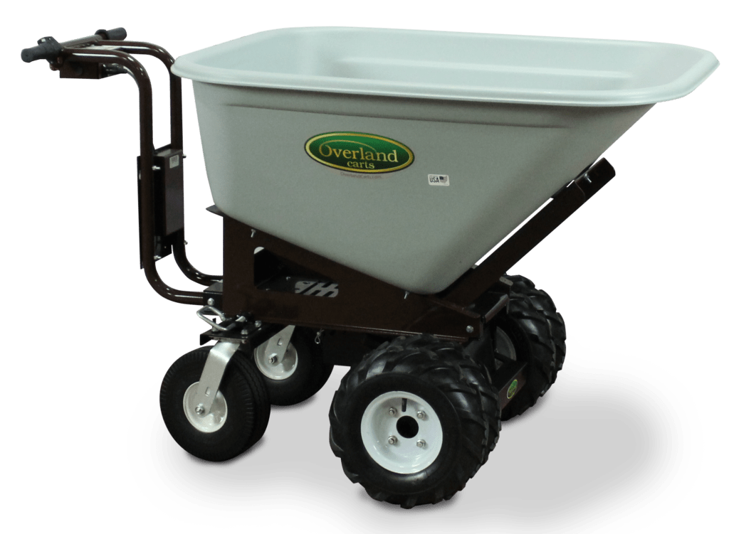 Each Overland Powered Cart is capable of hauling up to 750 lbs and up to 10 cubic feet.  The 750 lb capacity far exceeds the usable weight on a standard wheelbarrow (250 lbs).  The volume capacity of 10 cubic feet is double most standard wheelbarrows (5 cu. ft.).  Haul more on each trip with a fraction of the muscle fatigue.  Hopper sizes range from 6 cubic feet on our garden cart to 10 cubic feet on our commercial wheelbarrows.