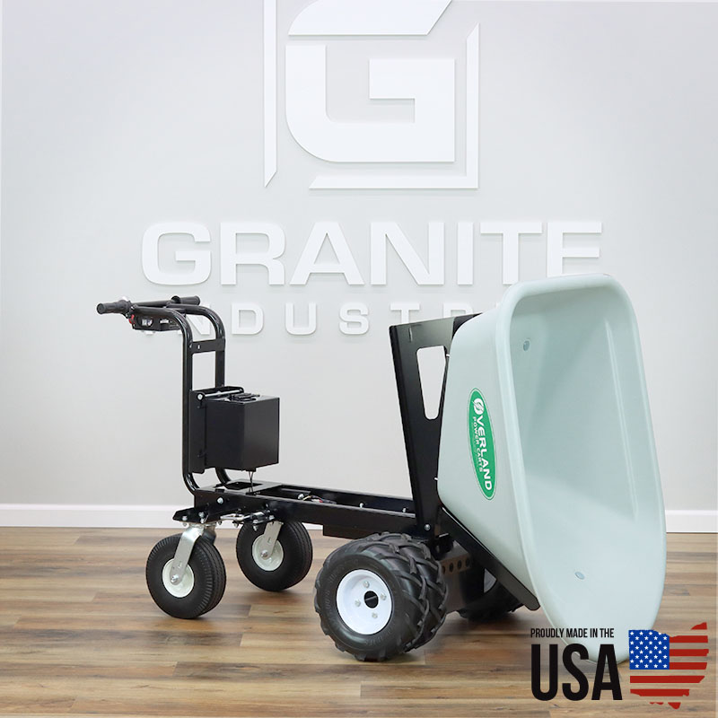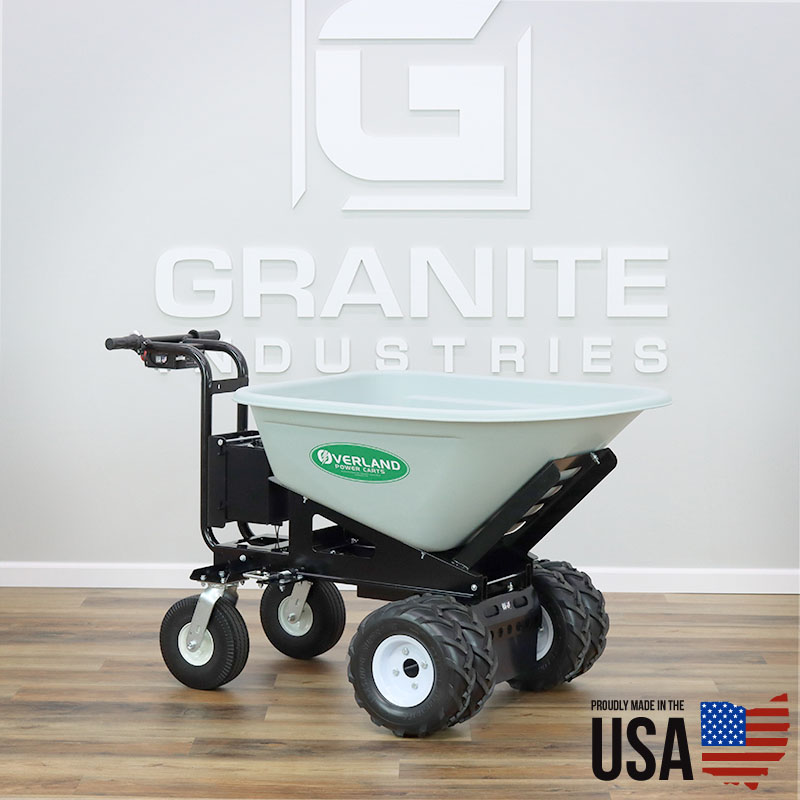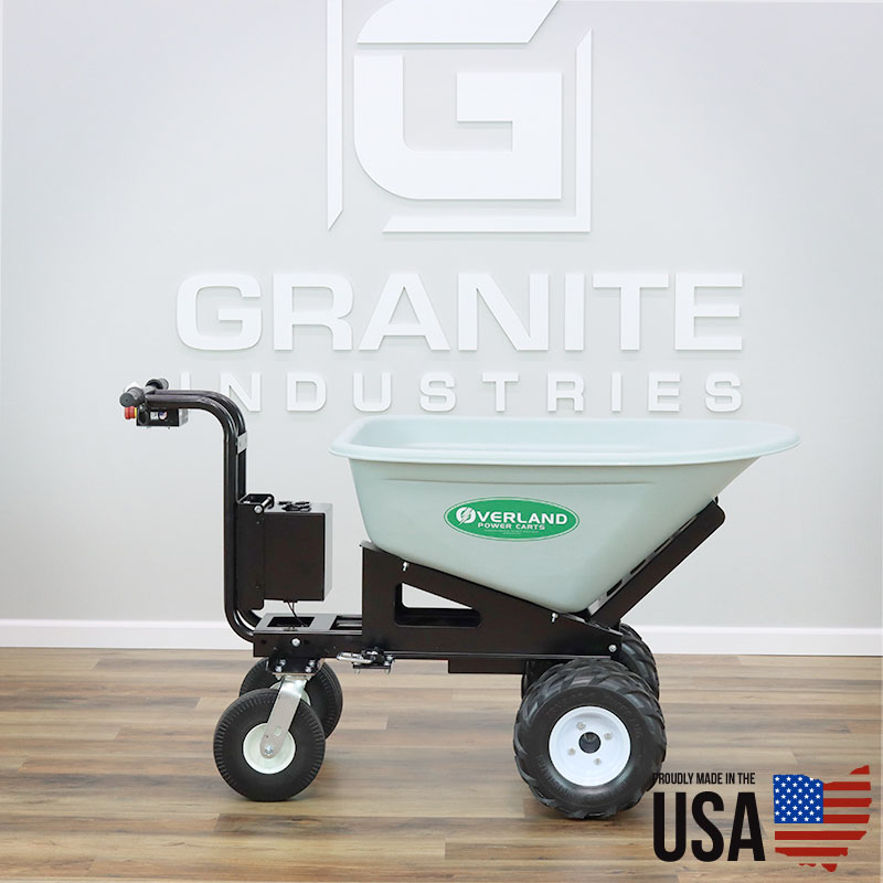 These carts have just enough room to get the job done. Haul mulch, dirt, stone, livestock feed or bedding. This is a great little cart to use outdoors, or even inside your barns. You can take this powered wheelbarrow places a large front end loader or tractor can’t go. Locking hinged hopper for easy dumping. We like to say, “Dump Your Old Wheelbarrow and Drive an Overland!”