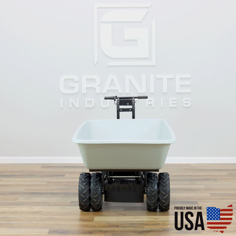Ideal for large bulky items: bags of feed, fertilizer, grass seed, dirt, mulch or landscaping stone. Has a large 9 cubic foot wagon style hopper which swings on a hinge to be lifted and dumped. You’ll be able to haul around up to 750 pounds and not break your back. Simply drive the cart by using the twist throttle and walk behind at up to 2.4 miles per hour. The four wheels make this more stable and much easier to handle than a typical wheelbarrow. Hinged tub lifts and dumps easily, and locks in place when not in use.